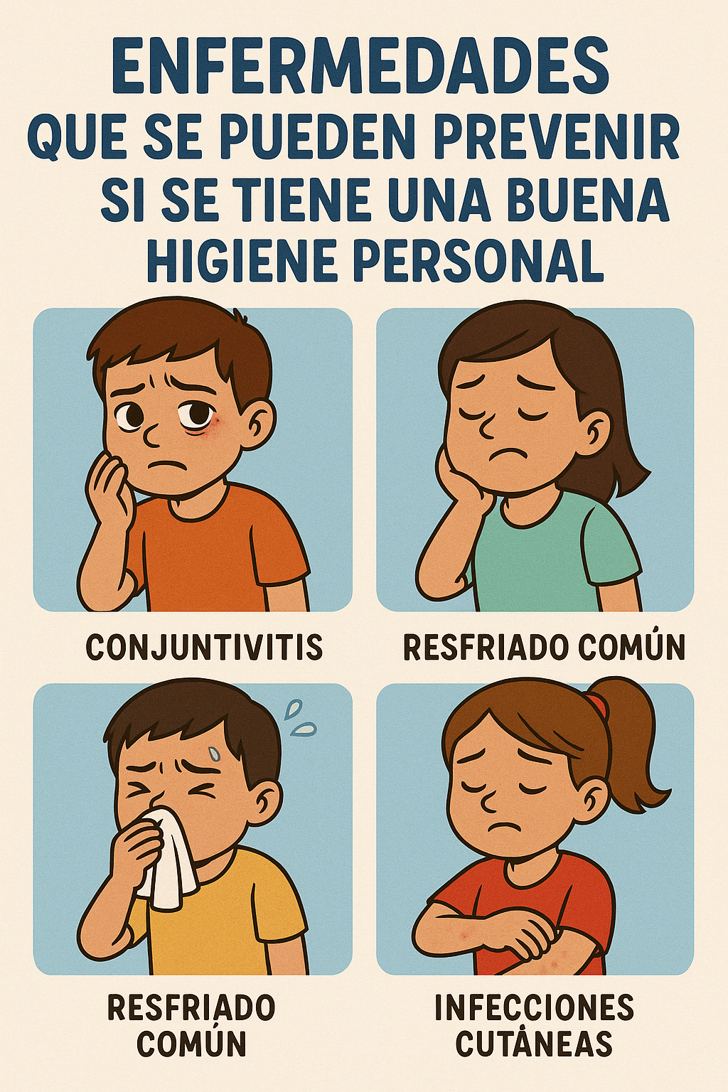 Una buena higiene personal es fundamental para prevenir diversas enfermedades comunes, especialmente en ambientes escolares. Hábitos como el lavado frecuente de manos, el baño diario, el cepillado de dientes y el uso de ropa limpia ayudan a evitar infecciones gastrointestinales, respiratorias, de la piel, bucales, urinarias y pediculosis. Estas prácticas no solo protegen la salud física, sino que también fortalecen la autoestima y el bienestar general de los estudiantes, promoviendo un entorno más sano, seguro y respetuoso para todos.